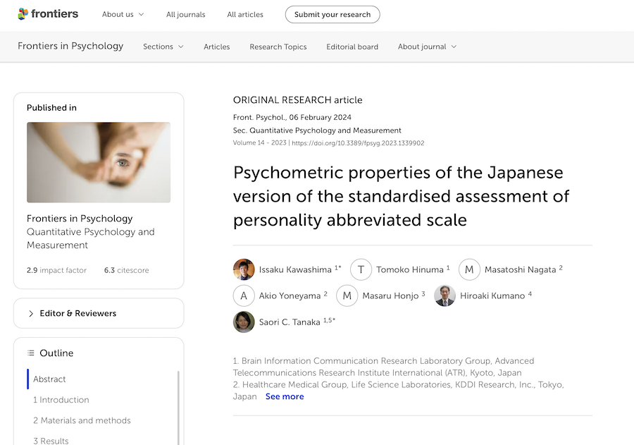 Hidenori Endoらの共著論文「Psychometric properties of the Japanese version of the standardised assessment of personality abbreviated scale」が、2024年2月6日 Frontiers in Psychiatry に掲載されました。