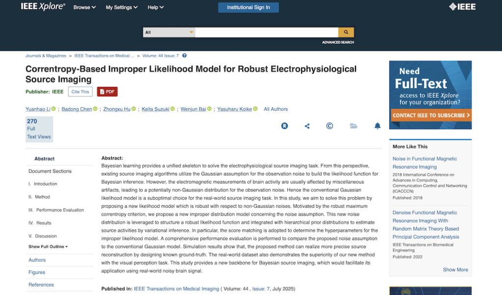 Yuanhao Liらの共著論文「Correntropy-based improper likelihood model for robust electrophysiological source imaging」が、2025年4月3日 IEEE Transactions on Medical Imaging に掲載されました。