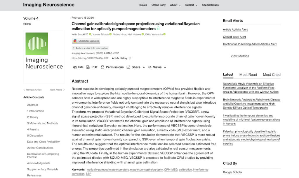 Keita Suzukiらの共著論文「Channel gain calibrated signal space projection using variational bayesian estimation for optically pumped magnetometers」が、2026年2月18日 Imaging Neuroscience に掲載されました。
