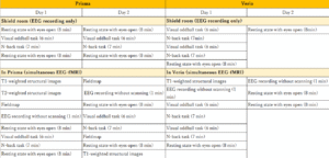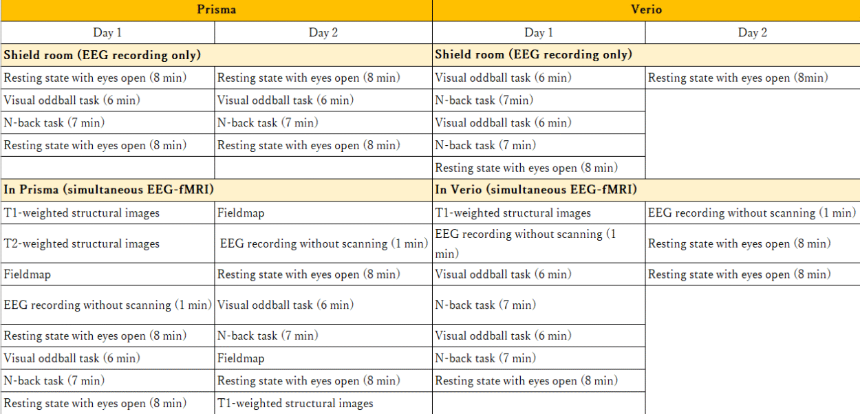 - EEG: BrainAmp MR plus, BrainAmp ExG MR, BrainCap MR (63-ch EEG, 1-ch ECG, 4-ch CWLs, Brain Products)